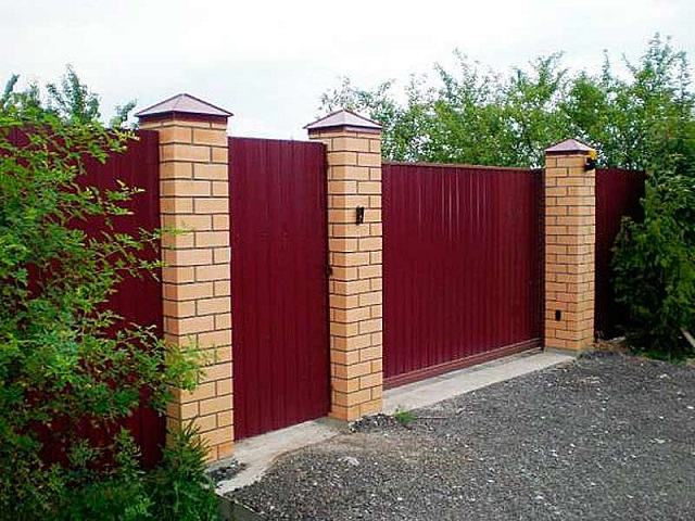 Конструкция забора из профлиста на ленточном фундаменте и с кирпичными столбами
